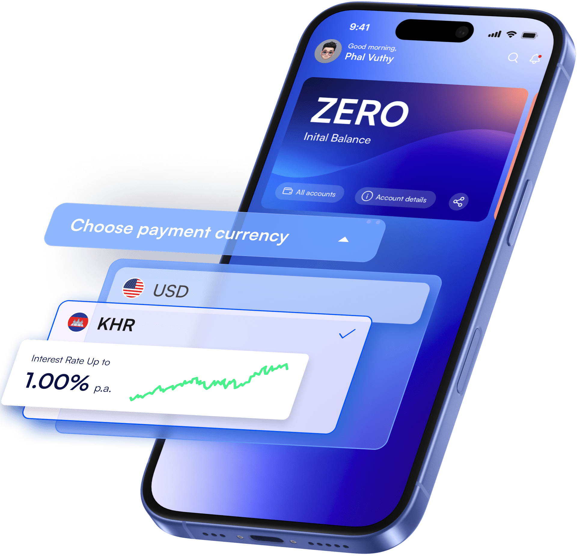 Enjoy up to 1% interest on your savings. Open an account effortlessly with just USD 10.00 and no minimum balance required for KHR.
